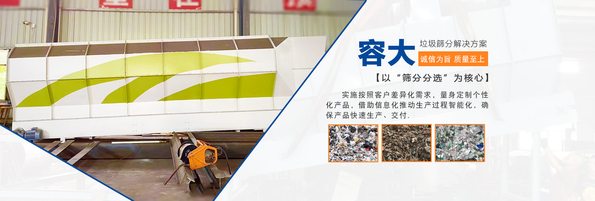 泉州容大機(jī)械有限公司是一家專(zhuān)研生活垃圾分選的企業(yè),以“篩分分選”為核心,實(shí)施按照客戶差異化需求,量身定制個(gè)性化產(chǎn)品,柔性化生產(chǎn)管理模式,以智能制造為主攻方向,以客戶需求為中心,借助信息化推動(dòng)生產(chǎn)過(guò)程智能化,確保產(chǎn)品快速生產(chǎn)、交付。生活垃圾處理領(lǐng)域內(nèi)的技術(shù)研究,利用篩分、分選技術(shù)的核心競(jìng)爭(zhēng)力,圍繞“智能、高效、節(jié)能、環(huán)保”八個(gè)大字為中心,為循環(huán)經(jīng)濟(jì)項(xiàng)下的各種生活垃圾處理項(xiàng)目提供成套的技術(shù)解決方案 ...